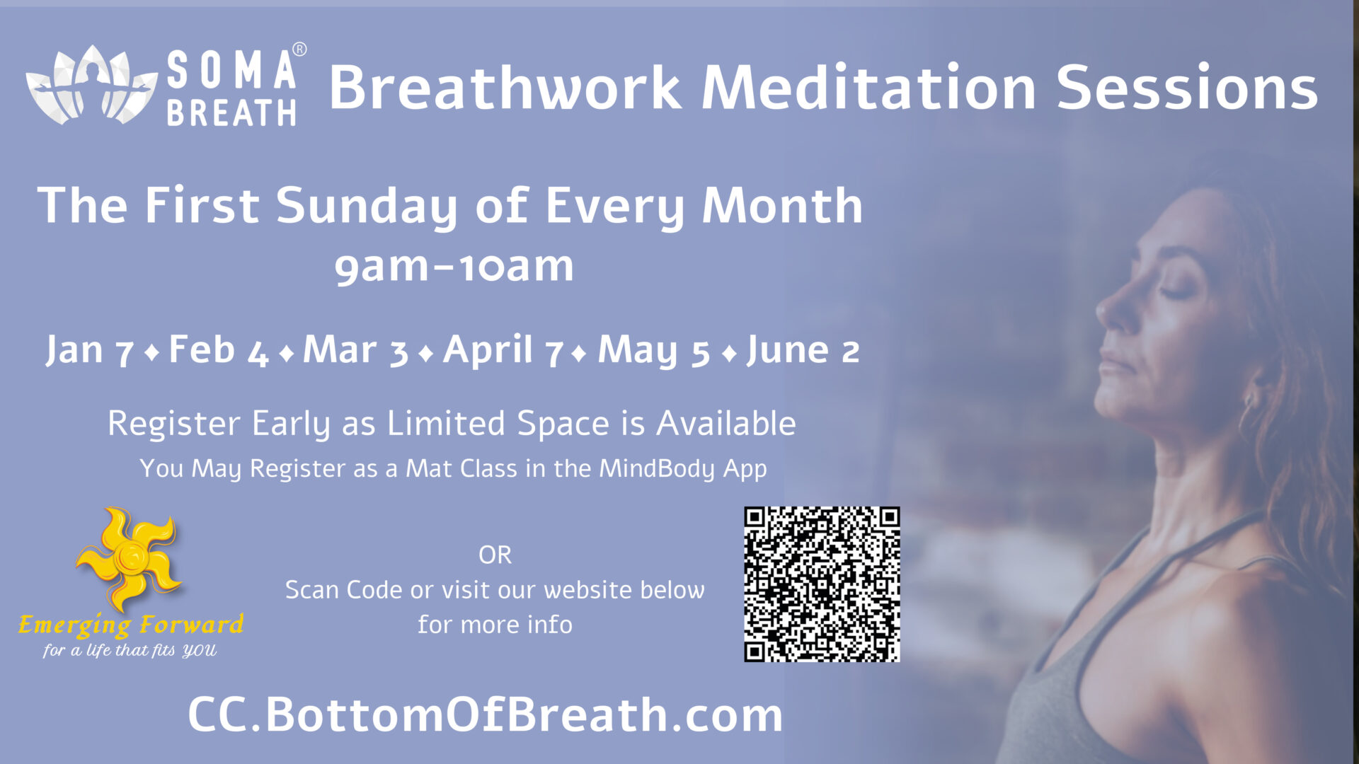SOMA Breath® is an approach to breathwork and breath therapy that includes certain techniques that can be used to resolve significant past events believed to be interfering with a person’s present mental and emotional wellness. Only people with sound mental health who are confident that a review of past events will not adversely impact their emotional or mental health should participate. We request that you do not participate in breath therapy of any kind if you or your treating practitioners have any past or existing concerns about your mental health.